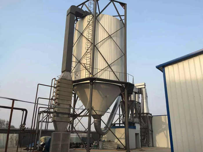 空气通过过滤器和加热器,进入干燥器顶部的空气分配器,热空气呈螺旋状均匀进入干燥器。料液由料液槽经过滤器由泵送至干燥器顶部的离心雾化器,使料液喷成极小的雾状液滴,料液和热空气并流接触,水分迅速蒸发,在极短时间内干燥成成品,成品由干燥塔底部和旋风分离器排出,废气由风机排出。